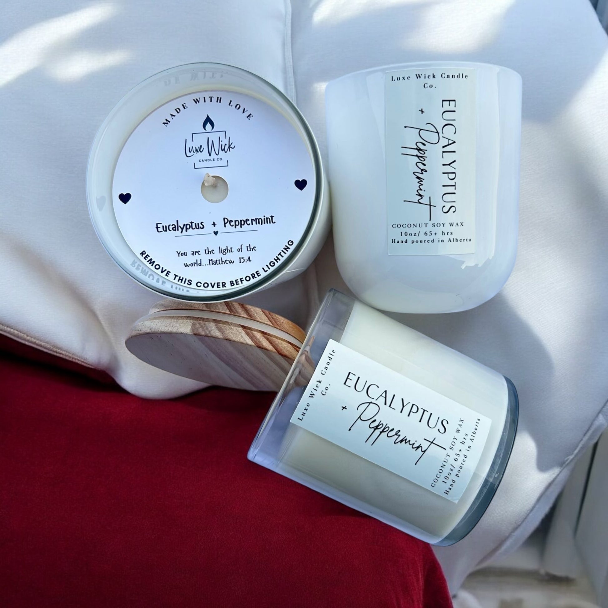 Transform your space with the Eucalyptus and Peppermint candle from Luxe Wick Candle Co. This 10 oz premium scented candle is made with eco-friendly coconut soy wax and a cotton wick, providing a clean, long-lasting burn.